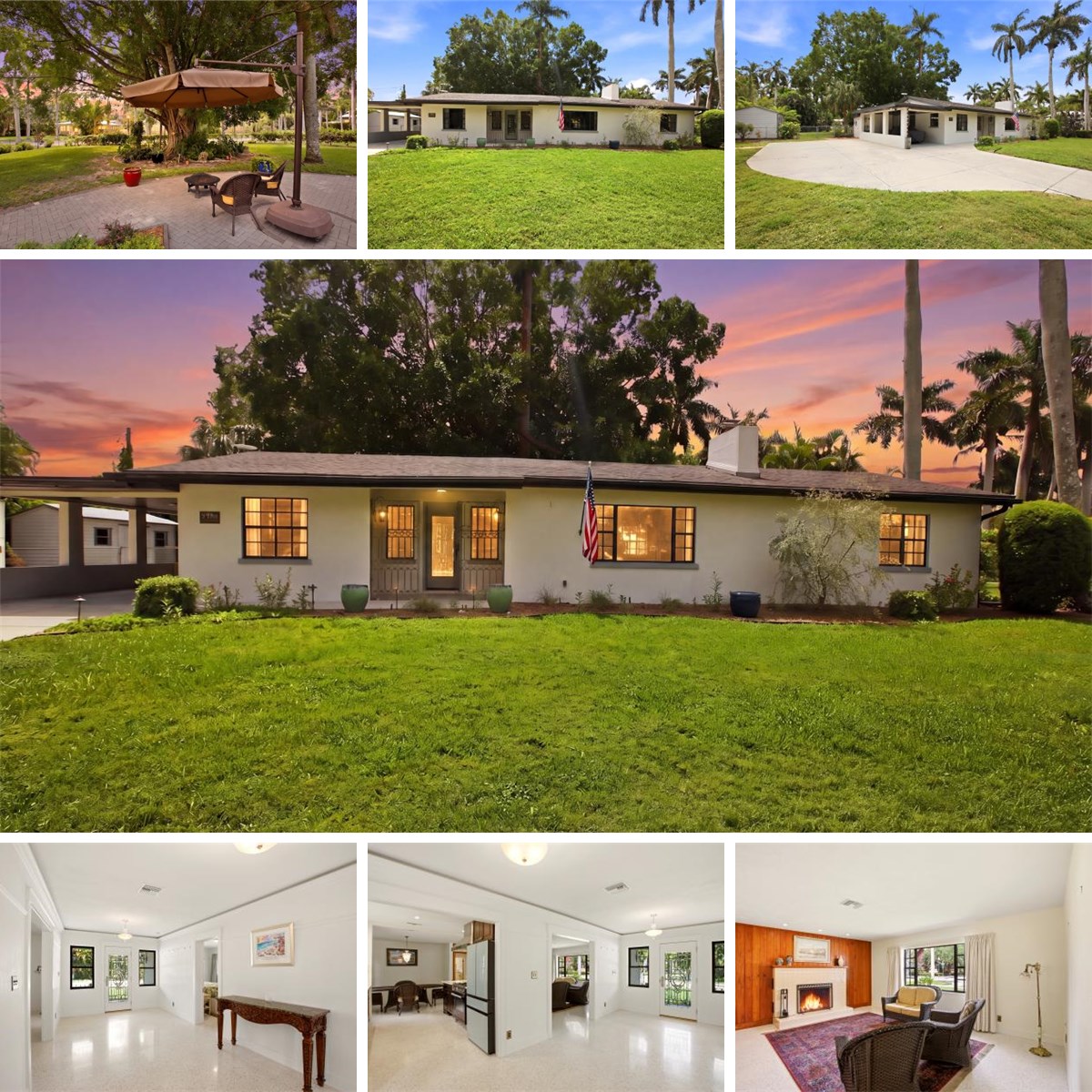 This 3-bedroom, 2-bathroom ranch-style home is set on an expansive .39-acre lot adjacent to the beautifully landscaped Triangle Park. Situated in the heart of the prestigious Dean’s Park Historic District, this charming residence captures the essence of classic Florida living. Renowned for its historic significance, picturesque streets, and enduring charm with no HOA! The fully fenced backyard provides exceptional privacy and generous outdoor space with a historic Banyan tree to provide shade in the hot summers. An attached covered carport offers convenient protection, while an additional paved area allows for ample parking—ideal for multiple vehicles or a boat. Significant improvements add peace of mind, including a whole house water filtration system, new plumbing in 2025, newer roof in 2019, and a tankless water heater 2023. The welcoming foyer opens into a spacious family room. Terrazzo flooring flows throughout the home, enhancing its clean lines and timeless appeal. Abundant natural light highlights the open, airy layout, while the central living space transitions seamlessly into the newly updated kitchen. Thoughtfully redesigned, the kitchen features an open layout to the dining/living areas. Highlights include 2023 appliances, professional-Bartazzoni gas range with a stainless vent hood, Bespoke refrigerator, new wine cooler, quartz countertops with lighting underneath for elegance and charm. An expansive peninsula offering additional prep space and casual seating. Light-finished upper cabinetry, including glass-front display cabinets, is beautifully balanced. A tile backsplash, recessed lighting, and a window over the sink complete this stylish and functional space. The living room is anchored by the refurbished original fireplace with a tiled surround set against a rich wood-paneled accent wall. The primary suite features a beautifully updated, spa-inspired bathroom. A glass-enclosed walk-in shower showcases floor-to-ceiling tile and sleek fixtures for a bright, streamlined look. A floating stone vanity with an integrated sink and contemporary hardware pairs elegantly with modern lighting. Two additional guest bedrooms are generously sized and share a vintage full bathroom that reflects the home’s timeless character. Additional interior highlights include a dedicated laundry room with utility sink. An attached utility shed adds even more convenience for tools and equipment and another detached 160-square-foot shed with electric. Step outside to a peaceful, private backyard designed for relaxation and entertaining. A spacious paver patio creates an inviting outdoor living area, ideal for gatherings or quiet evenings beneath mature trees. Lush landscaping and established greenery frame the yard, highlighted by a stunning Banyan tree that provides year-round comfort. The expansive backyard offers ample room for recreation, gardening, fruit producing mango tree all while maintaining a serene, park-like atmosphere. This home is just minutes from the vibrant Downtown Fort Myers River District, offering easy access to dining, boutique shopping, waterfront parks, live entertainment, and community events. Fort Myers Beach, Sanibel, Captiva, and Southwest Florida International Airport are all within an easy drive.
