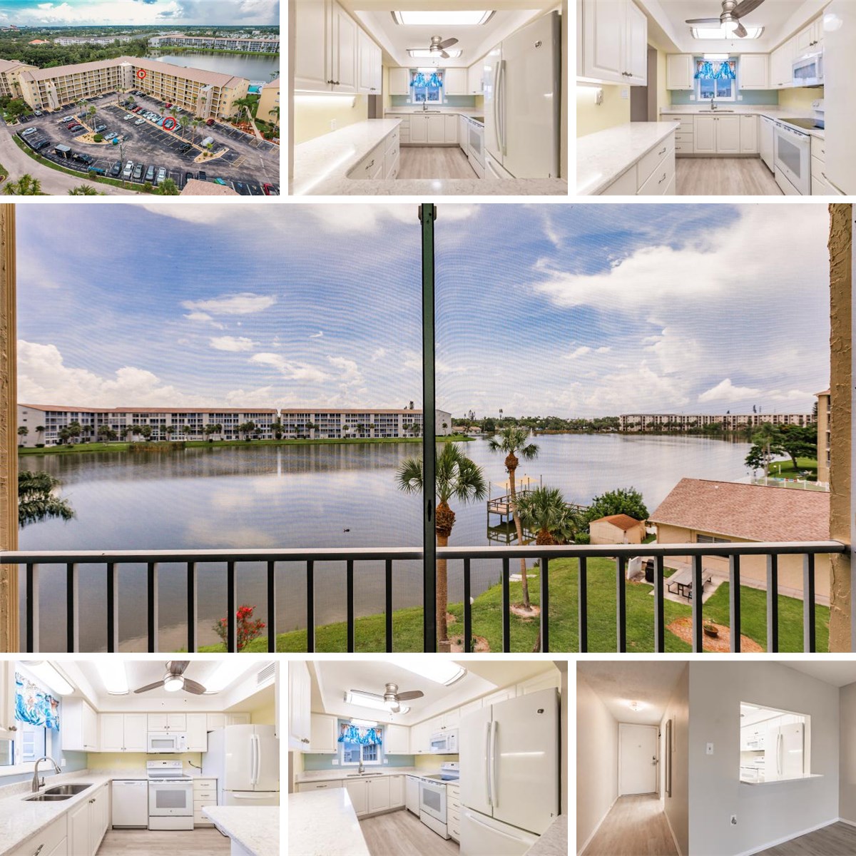 Looking for a spacious 2 bedroom, 2 bath home in a welcoming 55 plus community, rich with amenities, with a “million-dollar view” AND an attractive price? Look no further than this light, bright condo overlooking 19-acre Lake Bayshore. Bayshore on the Lake, Phase II has FULLY FUNDED RESERVES, a COMPLETED MILESTONE REPORT, a COMPLETED SIRS (Structural Integrity Reserve Study) and NO increase in the 2026 monthly fee. Other features that provide peace of mind are hurricane-impact windows and sliders, and many recent updates: water heater and disposal (2024), A/C (2021), kitchen appliances (2021) and luxury vinyl plank (2021) throughout. In addition, the Seller is providing a 13 mos. CHOICE ULTIMATE Home Warranty with a low $75 service call fee. The light, bright kitchen has recently installed quartz countertops, stainless steel deep sinks and faucet, with updated ceiling and white appliances (2021). The passthrough to the dining room is adorned with a quartz breakfast bar. The spacious dining room/living room combo is flanked by a custom slider leading you to the huge screened balcony from where you can feast your eyes on the morning sunrise over Lake Bayshore. You will also enjoy the lake view from the primary bedroom, which not only has a large walk-in closet but also an ensuite bath and private office nook. Another custom slider provides easy access from the primary bedroom to the PRIVATE LAUNDRY closet on the balcony which houses a FULL-SIZE SAMSUNG WASHER and DRYER (2021) and something that is a rarity in most condos – a UTILITY SINK!!! Both baths have updated vanities and toilets. Modern fans have been installed in the kitchen, living room, both bedrooms and screened balcony. Talk about LOCATION, LOCATION, LOCATION … in addition to this spectacular view, the unit is located just two doors from the elevator with an assigned parking spot in near the front of the building (see photo) and close to the pool & clubhouse. Bayshore on the Lake is in the heart of Bradenton, close to shopping, restaurants, the beaches of Anna Maria Island, downtown Sarasota, UTC Mall, the Ringling Museum, the Asolo Theater and the Manatee Players. Monthly condo fee of $569 includes heated pool, clubhouse, shuffleboard, internet, basic tv, trash, exterior and grounds maintenance, building insurance, and management company. Sorry no pets except for support animals (condo approval required). Tired of maintaining your yard or shoveling snow? - trade it for a day of fishing from the pier, kayaking on the lake or lounging in the heated pool. Schedule your private showing today! All dimensions are approximate.