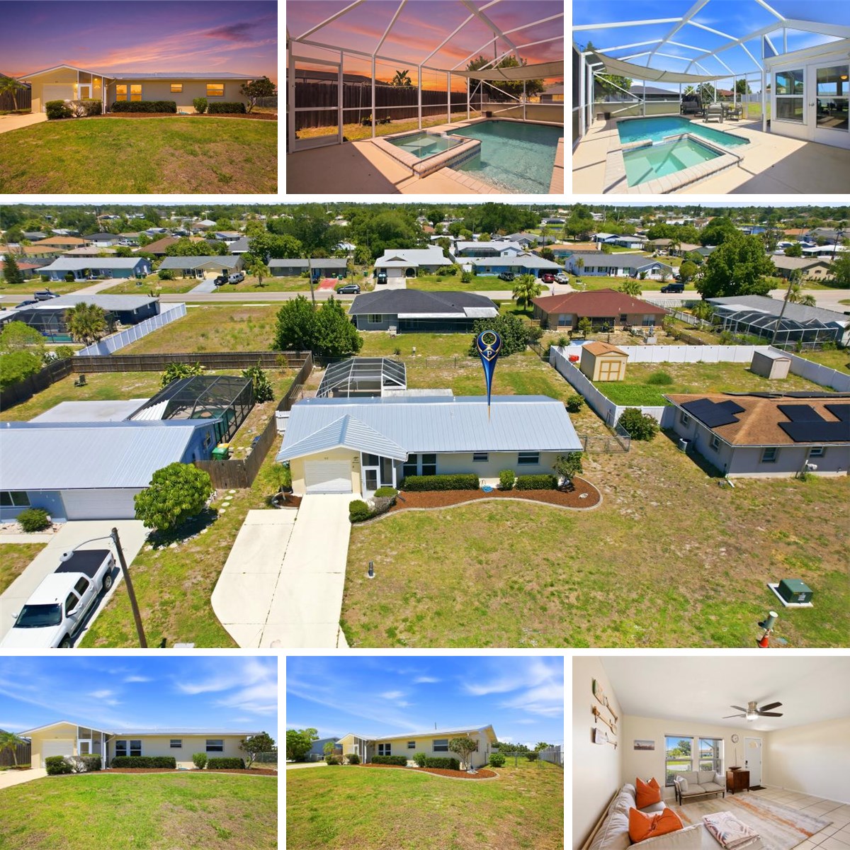 Enjoy relaxed Florida living in this beautifully updated 1,014-square-foot pool home offering 2 bedrooms and 2 baths, thoughtfully designed for comfort, style, and outdoor enjoyment. Recent enhancements include fresh earth-toned interior paint, new ceiling fans and light fixtures throughout, refreshed curb appeal, and all new wood in the attic—adding both style and peace of mind. Additional upgrades include a new galvanized metal roof (2023) with a transferable warranty, impact windows, and the convenience of an attached single-car garage with laundry. A screened front porch welcomes you inside to a spacious living room with tile flooring and updated ceiling fans, flowing seamlessly into the dining area and renovated kitchen. The kitchen is both stylish and functional, showcasing crisp white shaker cabinetry accented by sleek dark hardware, expansive granite countertops, and a generous breakfast bar—perfect for casual dining or entertaining. Stainless steel appliances, including a French-door refrigerator, built-in microwave, and electric range, complete the space, while recessed lighting and durable tile flooring enhance its bright, modern appeal. The open layout allows for easy connection to the living and dining areas, ideal for everyday living and gatherings alike. Sliding glass doors fill the home with natural light and provide a seamless transition to the outdoor living space. The primary suite offers a large built-in closet and a beautifully updated en-suite bath featuring a modern vanity, contemporary lighting, mirrored medicine cabinet, and a walk-in shower with glass enclosure, tiled surround, and built-in niche—creating a bright, spa-like retreat. The guest bedroom, located at the front of the home, is generously sized and enjoys access to its own full bath. The updated guest bathroom features a stylish vanity with vessel sink, sleek hardware, and a tub/shower combination with tiled surround, all complemented by neutral finishes and natural light. Just off the dining area, a sun-filled Florida room is surrounded by operable windows, inviting in fresh air and abundant light, and is equipped with a ceiling fan for year-round comfort. Step outside to your private backyard oasis, fully fenced for added privacy and featuring a heated pool and spa (2008), all enclosed within a spacious pool cage—perfect for entertaining, relaxing, and enjoying the Florida lifestyle year-round. Ideally located in Port Charlotte, this home offers convenient access to shopping, dining, and everyday necessities along Tamiami Trail, with a variety of popular restaurants, grocery stores, and services just minutes away. Enjoy an active Florida lifestyle with nearby parks, nature preserves, fishing piers, boat ramps, and access to Charlotte Harbor for boating and kayaking. Gulf beaches are an easy drive away, perfect for day trips to enjoy sun and sand, while nearby airports—including Punta Gorda Airport—provide convenient travel options. Charlotte Sports Park, community events, and additional dining and entertainment in Charlotte Harbor and Punta Gorda round out this desirable location.